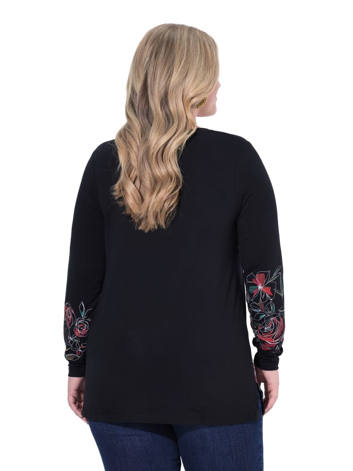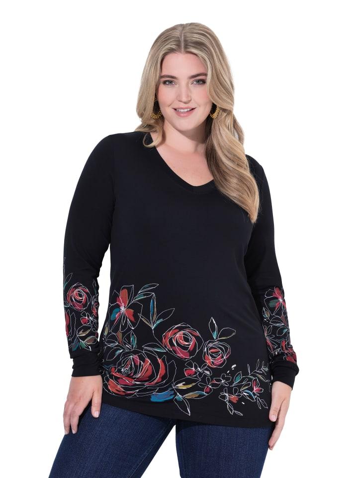 Футболка Classic Fit из комфортного эластичного вискозного трикотажа с цветочным принтом, резинкой по низу и длинными рукавами. V-образный вырез. Внешний материал: 95% вискоза, 5% эластан.