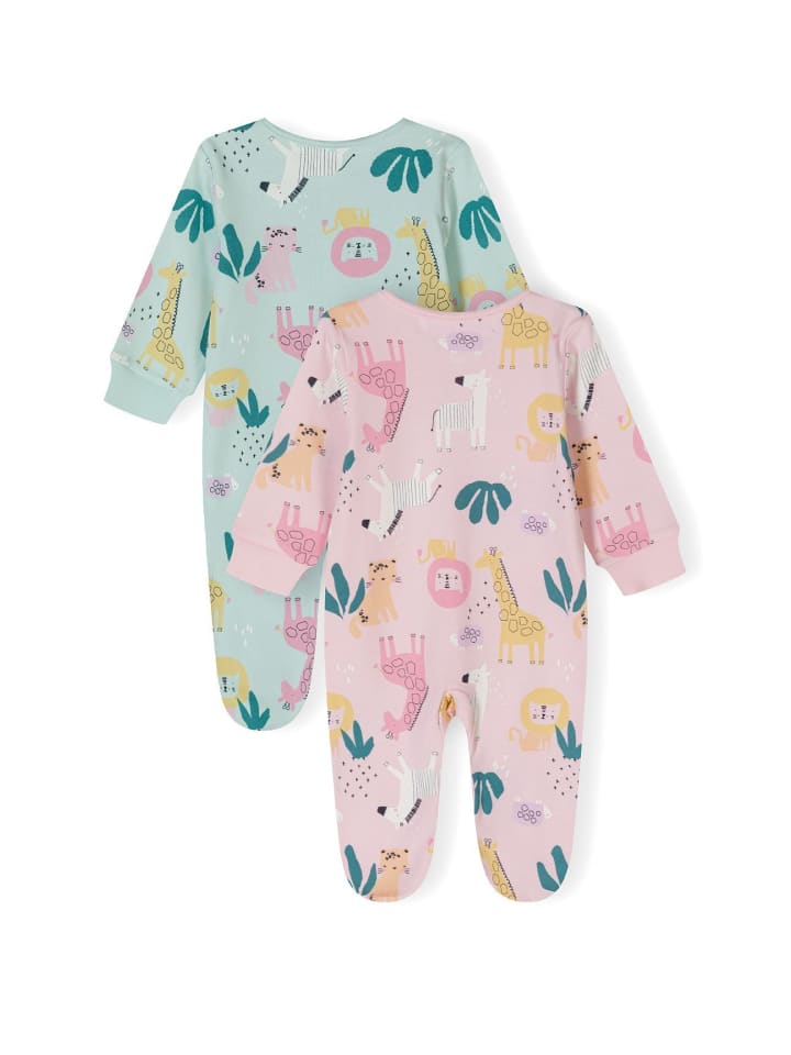 В наборе две пижамы с длинными рукавами и ножками. Застежки-кнопки спереди значительно облегчают переодевание ребенка. Изготовлены из мягкого хлопкового трикотажа с милым принтом.