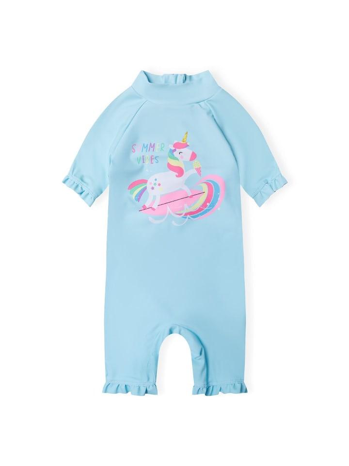 Полосатый комбинезон с защитой от ультрафиолета, красивыми аппликациями и оборками на рукавах и штанинах. Идеально подходит для пляжа и бассейна.