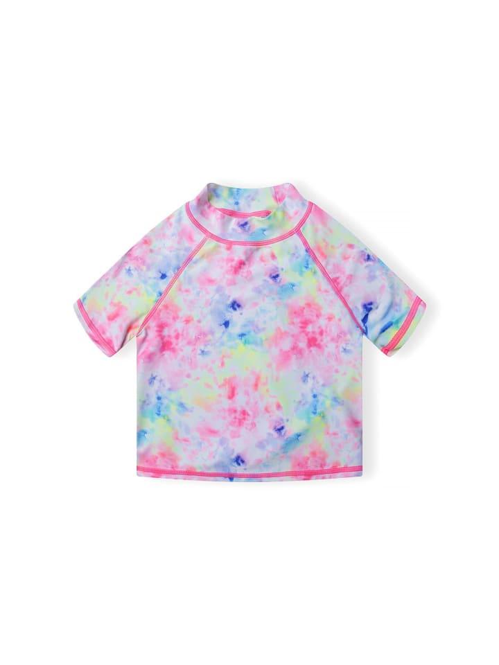 Яркий комплект с модным и стильным топом с короткими рукавами и подходящими трусиками с рюшами. Этот комплект отлично подходит для пляжа или бассейна, так как защищает от солнца благодаря УФ-фильтру.