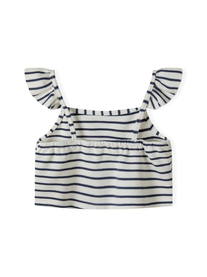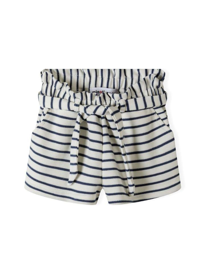 Комплект для девочки в полоску из мягкого муслина. Блузка на пуговицах спереди, с короткими рукавами и оборками, а также шорты в тон с эластичным поясом.