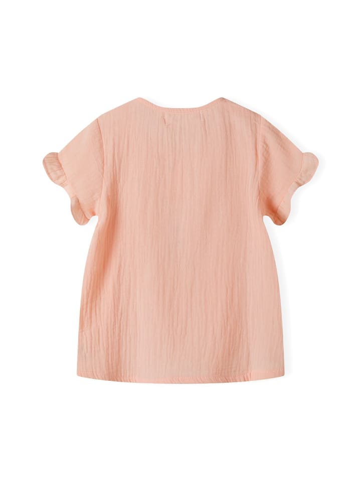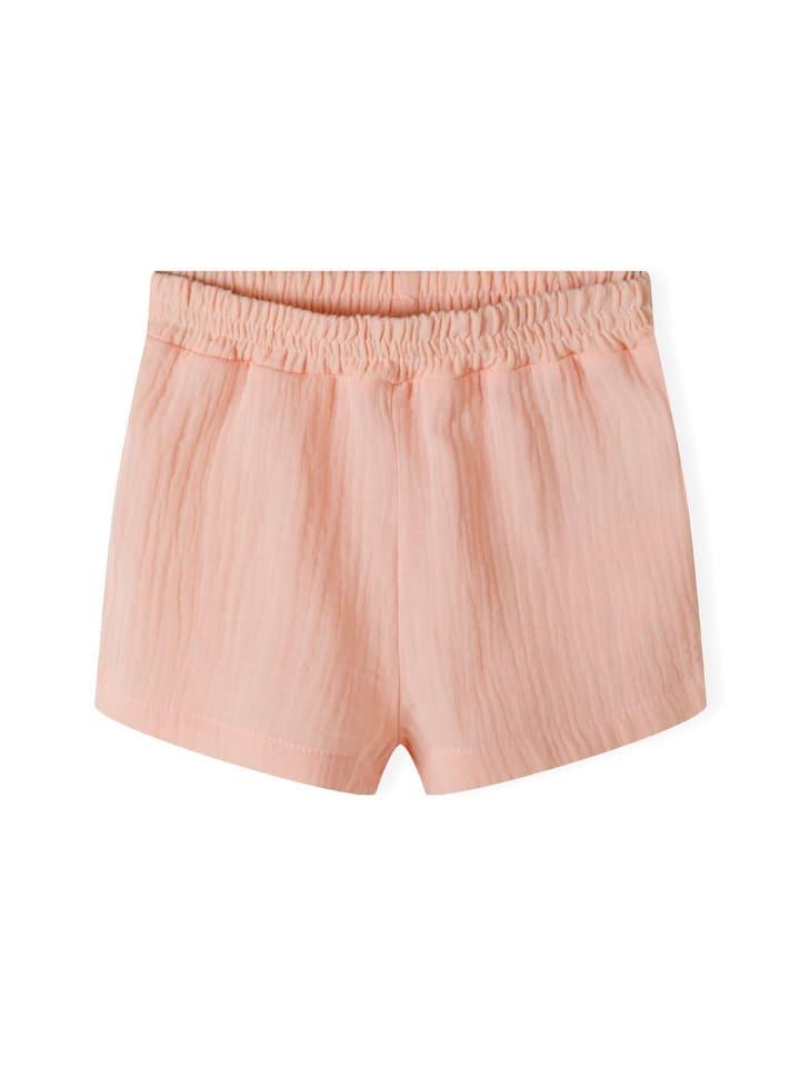 Этот комплект для девочки выполнен из мягкого муслина. Блузка застегивается на пуговицы и имеет короткие рукава с оборкой, а шорты в комплекте - на резинке.