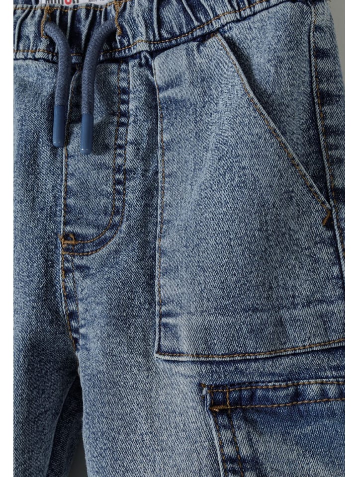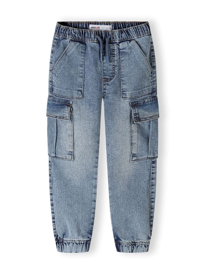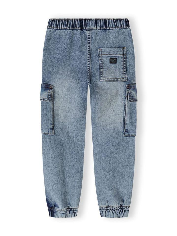Джинсы свободного кроя с карманами-карго. Эластичный пояс со шнурком, эластичные манжеты на штанинах. Накладные карманы на бедрах и накладной карман сзади.