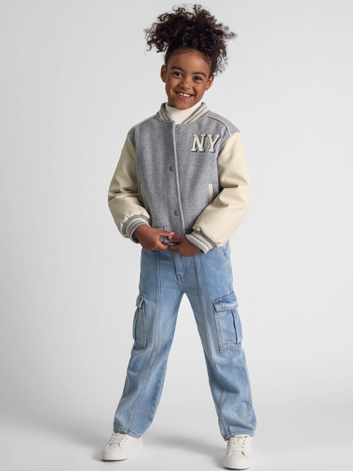Эта бейсбольная куртка для девочек идеально подходит для переходного периода. Она имеет легкую, гладкую подкладку и застежку на кнопки по всей длине. Рукава выполнены из искусственной кожи для модного образа. Ребристые манжеты на воротнике, рукавах и подоле украшены контрастными полосками. Боковые карманы и красивая вышивка NY на груди делают куртку особенно модной.