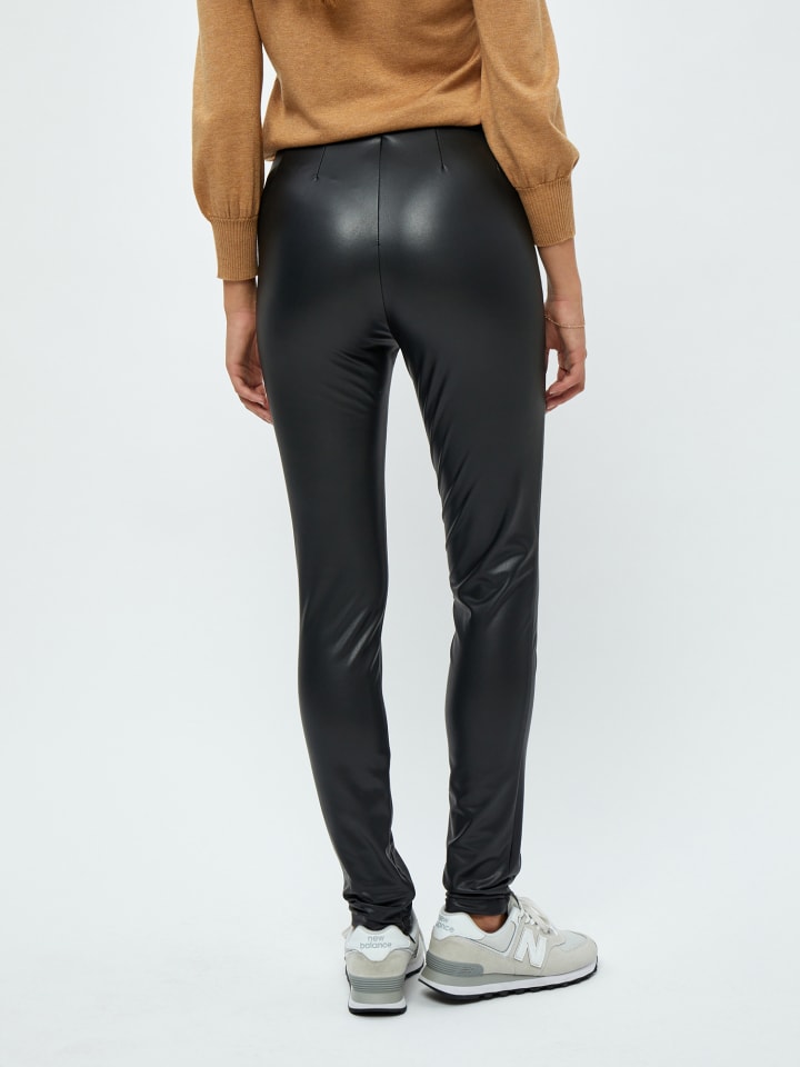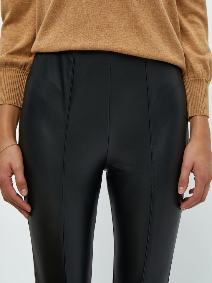 Леггинсы из искусственной кожи с потайным эластичным поясом и боковой молнией. Леггинсы имеют два декоративных шва спереди на каждой штанине и складки на талии сзади. Также на штанинах есть две потайные молнии.