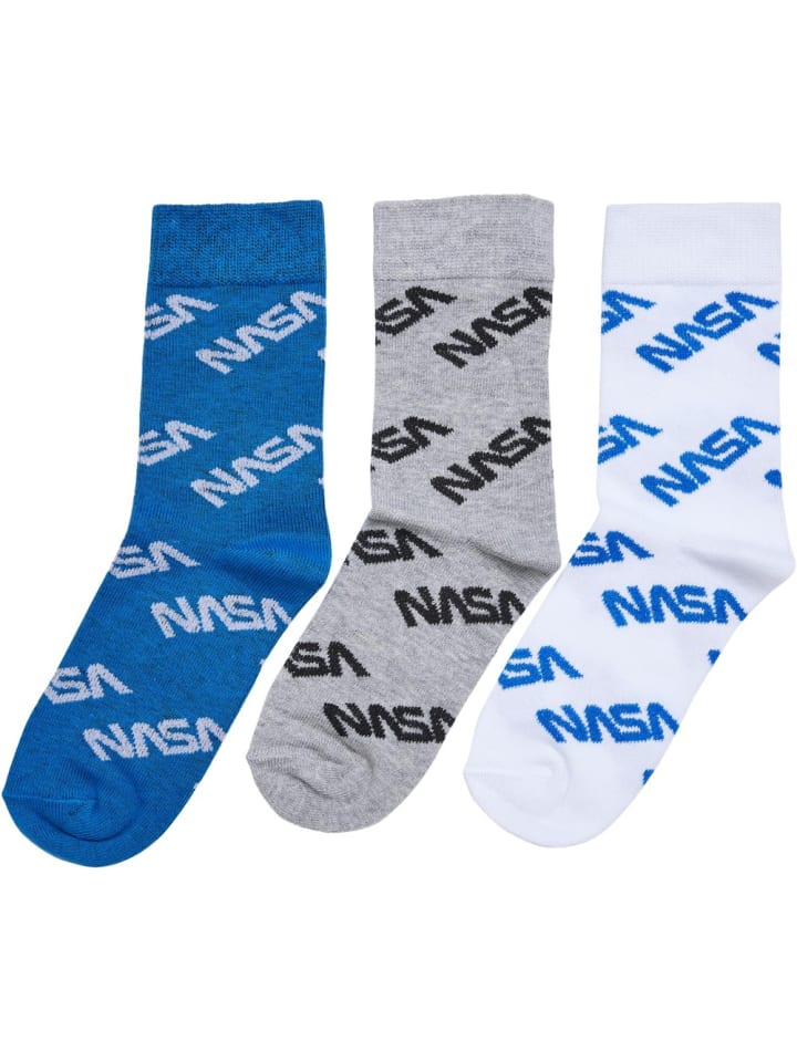 Комплект носков состоит из трех пар детских носков, каждая из которых украшена косым узором NASA по всей поверхности и представлена в трех различных цветовых вариантах. Высокая посадка по икрам и широкие ребристые манжеты, а также функциональный материал из хлопка, полиэстера, нейлона и эластана обеспечивают оптимальный комфорт. Детские носки доступны в четырех размерах.