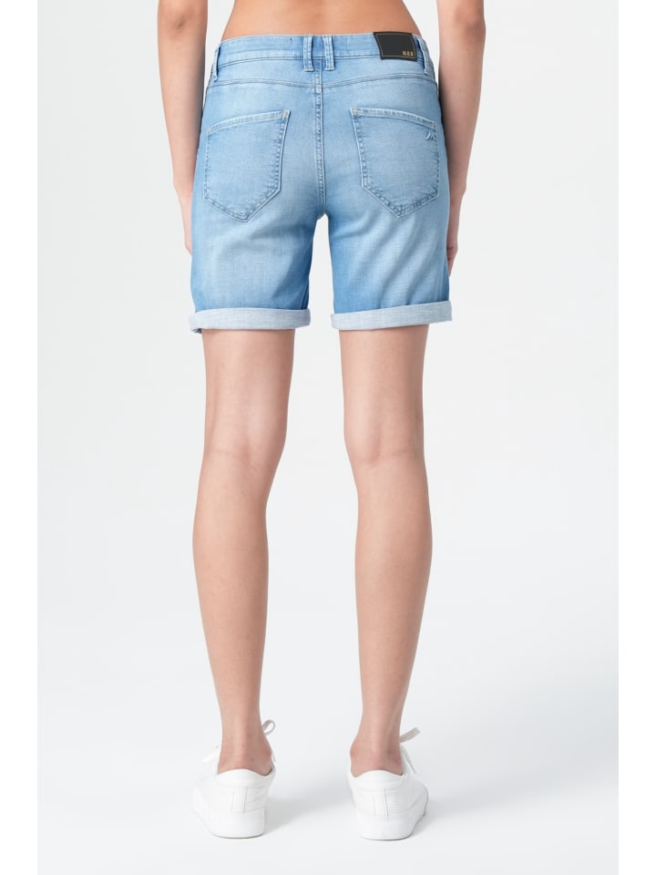Lucky женские джинсовые шорты Drive Blue - Премиальные бермуды в гармоничном цвете Drive Blue. Женские джинсовые шорты Lucky в цвете Drive Blue воплощают летнюю легкость и стильный комфорт. Высококачественная смесь материалов 98% хлопка и 2% эластана обеспечивает приятную свободу движений и идеальную посадку для любого занятия. Бермуды средней длины с подвернутыми краями штанин придадут вам непринужденный элегантный вид. Равномерный светлый оттенок Drive Blue впечатляет своей свежестью и предлагает универсальные возможности для комбинирования вашего летнего гардероба. Классический крой с пятью карманами с традиционными передними карманами и утягивающими задними карманами подчеркивает вневременной образ этого летнего фаворита. Строгий стиль и эстетический комфорт: средне-завышенная талия шорт Lucky подчеркивает ваш силуэт и обеспечивает оптимальный комфорт в жаркие дни. Застежка на пуговицы со скрытой молнией обеспечивает надежную посадку, а боковые шлевки для ремня открывают индивидуальные возможности для создания стиля. Сзади ненавязчивый фирменный лейбл добавляет стильный акцент. Аккуратные швы и продуманные детали свидетельствуют о высоком качестве и долговечности. Слегка потертый вид и мягкость материала создают ощущение настоящего денима и комфорта. Эти универсальные джинсовые шорты легко сочетаются с белыми кроссовками и любимыми топами - незаменимая базовая вещь для вашего летнего гардероба.