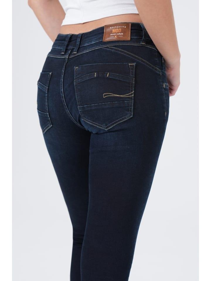 SUZY NOS женские джинсы скинни Verona Blue - Идеальный силуэт с аутентичной потертостью денима. Женские джинсы скинни SUZY NOS в цвете Verona Blue от MOD впечатляют интенсивной равномерной потертостью и легкими потертостями, которые придают дениму его аутентичный характер. Высококачественное сочетание материалов 84% хлопка, 13% полиэстера и 3% эластана обеспечивает оптимальную свободу движений и идеальную посадку. Средняя талия и облегающие штанины создают женственный силуэт, который особенно хорошо подходит для осенних многослойных образов. Аккуратно выполненные контрастные швы золотистых тонов добавляют стильные акценты, а классическая конструкция с пятью карманами впечатляет функциональными деталями. Узкие шлевки для ремня и высококачественная металлическая пуговица дополняют изысканный дизайн. Универсальный компаньон для прохладных дней. Будь то свитера крупной вязки, элегантные блузки или повседневные топы с длинными рукавами, эти джинсы скинни станут идеальной основой для ваших осенних нарядов. Глубокий оттенок веронского синего прекрасно сочетается с теплыми земляными тонами и легко сочетается с ботинками или кроссовками. Гладкая внутренняя часть и аккуратные швы гарантируют высокий комфорт при ношении, а структурированный деним сохраняет форму даже после многочисленных стирок.
