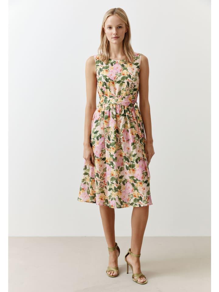 Это красочное платье без рукавов от MORE \ u0026 MORE из легкой смеси хлопка и вискозы обязательно вызовет у вас желание лета. Это привлекательное платье с принтом создаст спортивный образ с джинсовой курткой и кроссовками или элегантно с жакетом-букле и туфлями на каблуках.