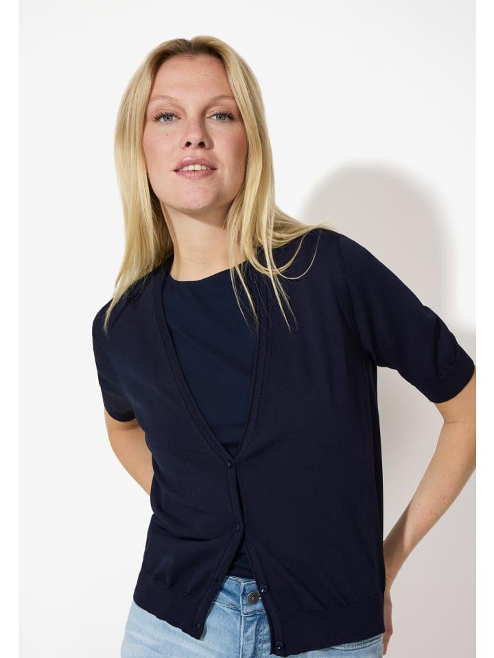 Этот темно-синий кардиган от MORE \ u0026 MORE с V-образным вырезом и планкой на пуговицах станет идеальным дополнением к летним платьям, но также будет очень мило смотреться с широкими юбками и спортивными шортами.
