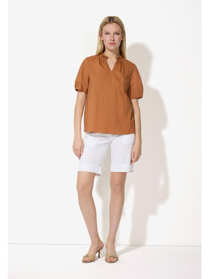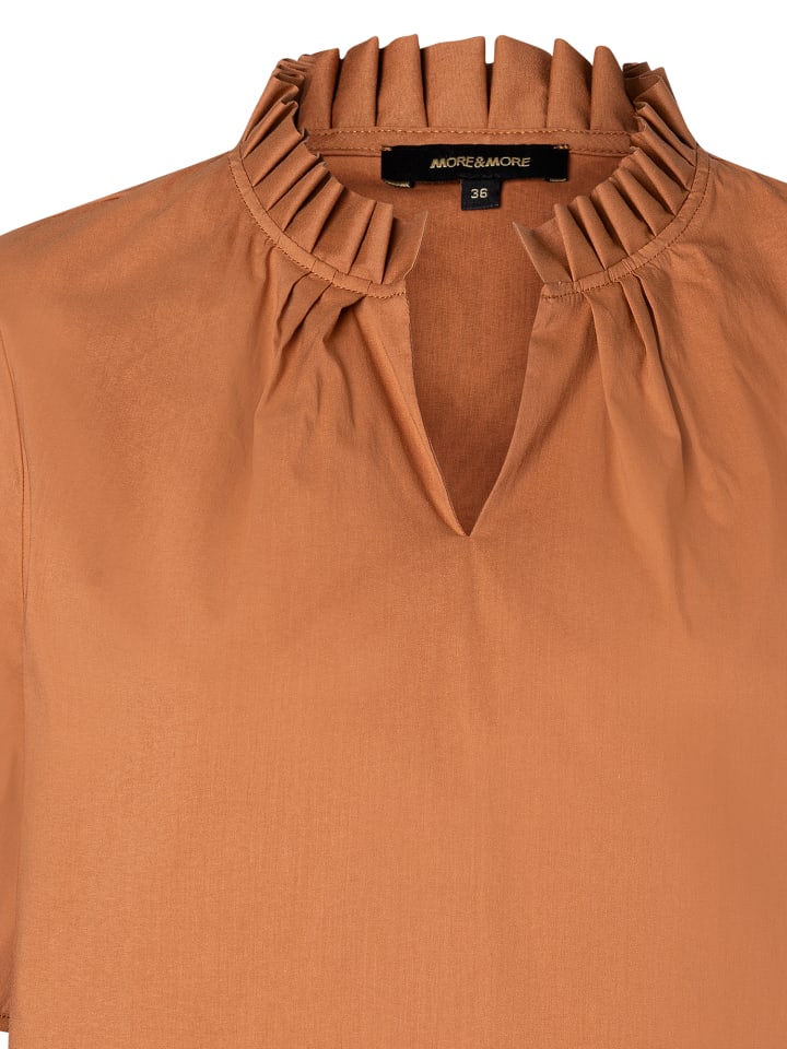 Эта современная блузка с коротким рукавом от MORE \ u0026 MORE, с плиссированным воротником-стойкой и небольшим V-образным вырезом спереди отлично сочетается с классическими деловыми брюками, выцветшими джинсами или летними хлопковыми чиносами.