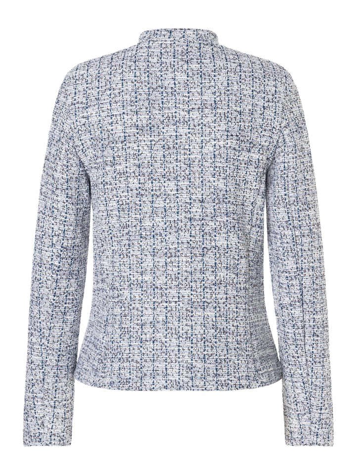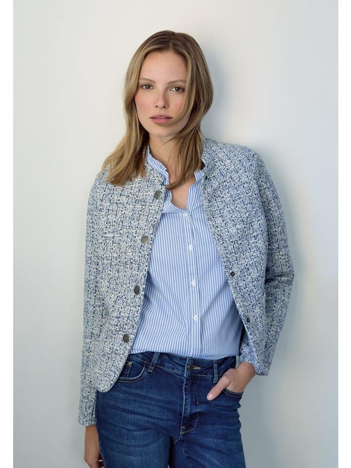 Эта короткая трикотажная куртка от MORE \ u0026 MORE с нежным полосатым рисунком одинаково хорошо смотрится и со спортивными джинсами, и с классическими деловыми брюками, и с женственным платьем-футляром, а также невероятно удобна и проста в уходе.