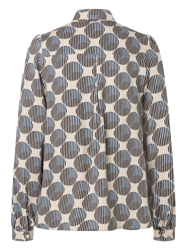 Струящаяся вискозная блузка MORE \ u0026 MORE с графическим принтом в темно-синем/бежевом/среднем синем цвете отлично смотрится с выцветшими джинсами, но ее также можно носить с классическими деловыми брюками.