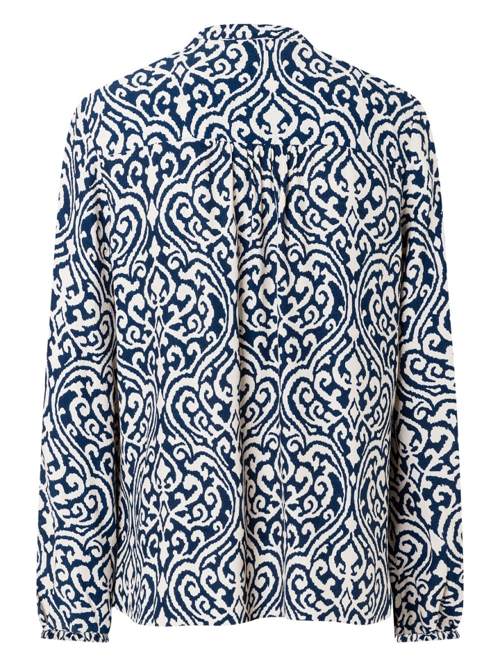 Струящаяся вискозная блузка MORE \ u0026 MORE с современным орнаментальным принтом в темно-синем/песочном цвете одинаково хорошо смотрится как с классическими деловыми брюками, так и с выцветшими джинсами.