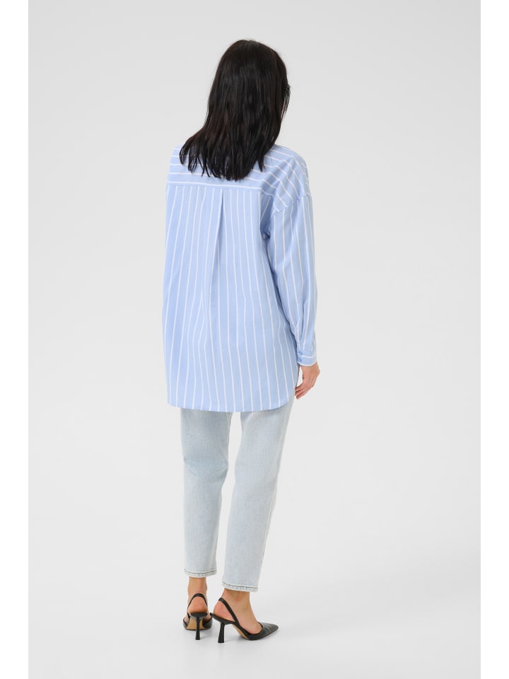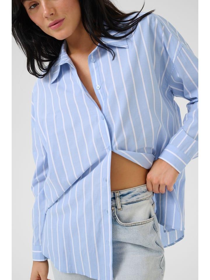 Рубашка в полоску с застежкой на пуговицы, свободным прямым кроем, классическим воротником и длинными рукавами с манжетами на пуговицах.