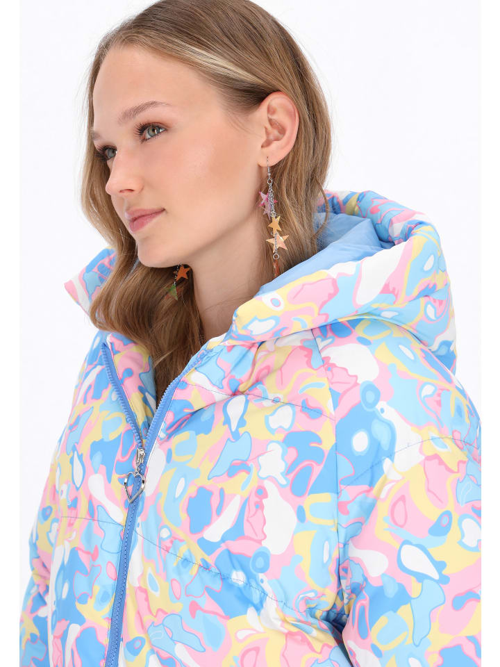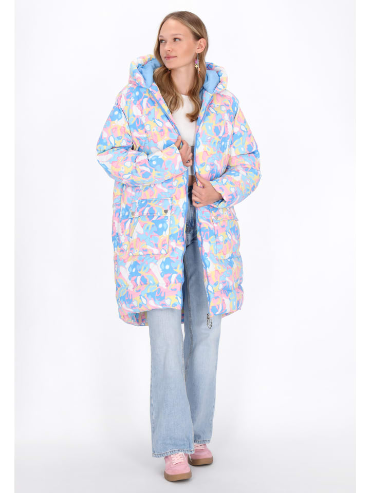 Это пальто свободного кроя - идеальное сочетание комфорта и модного молодежного стиля. Оно украшено абстрактным рисунком. У него практичный капюшон, длинные рукава реглан и застежка на молнию. Карманы с клапанами добавляют функциональности и подчеркивают повседневный характер. Легкое, теплое и невероятно удобное, оно идеально подходит для повседневного ношения, обеспечивая защиту от холода и добавляя немного очарования. Входит в коллекцию верхней одежды, созданную для ценителей моды.