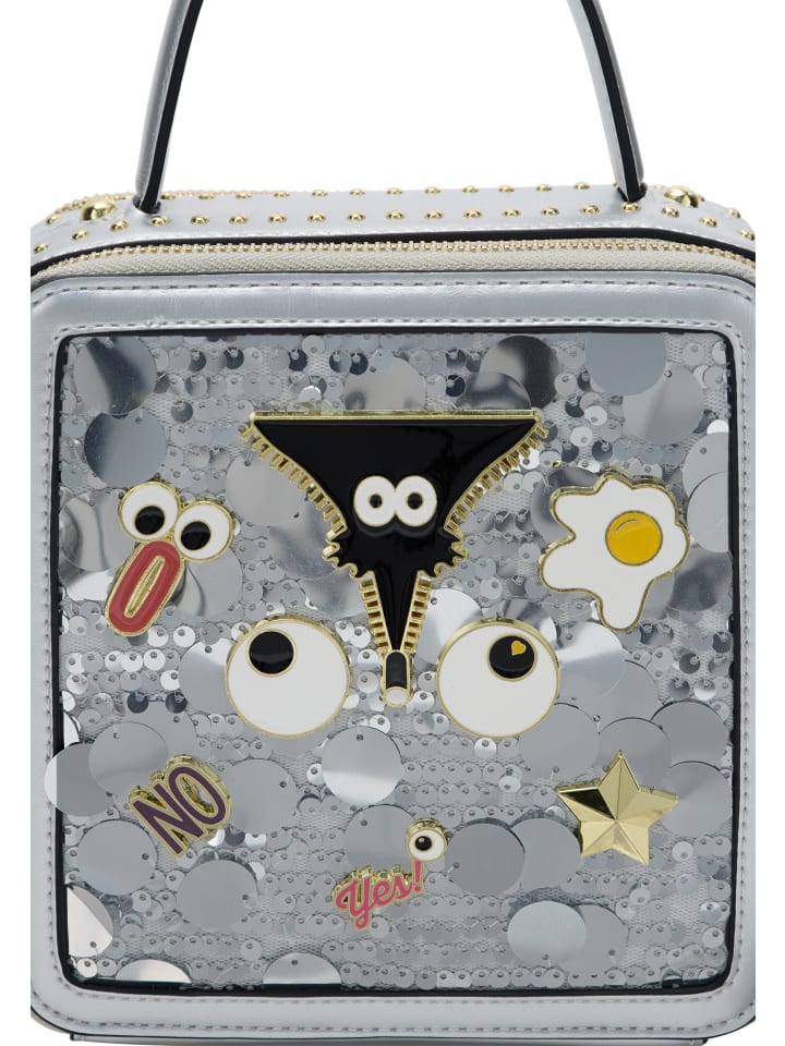 Откройте для себя эту модную квадратную сумку с абстрактным узором и игривыми деталями. Застежка на молнию и съемный ремешок позволяют создавать разнообразные образы. Причудливый дизайн дополнен мультяшными глазами и металлическими акцентами, а внутренний карман на молнии обеспечит порядок в любой ситуации. Этот продукт входит в коллекцию Eyetheme.