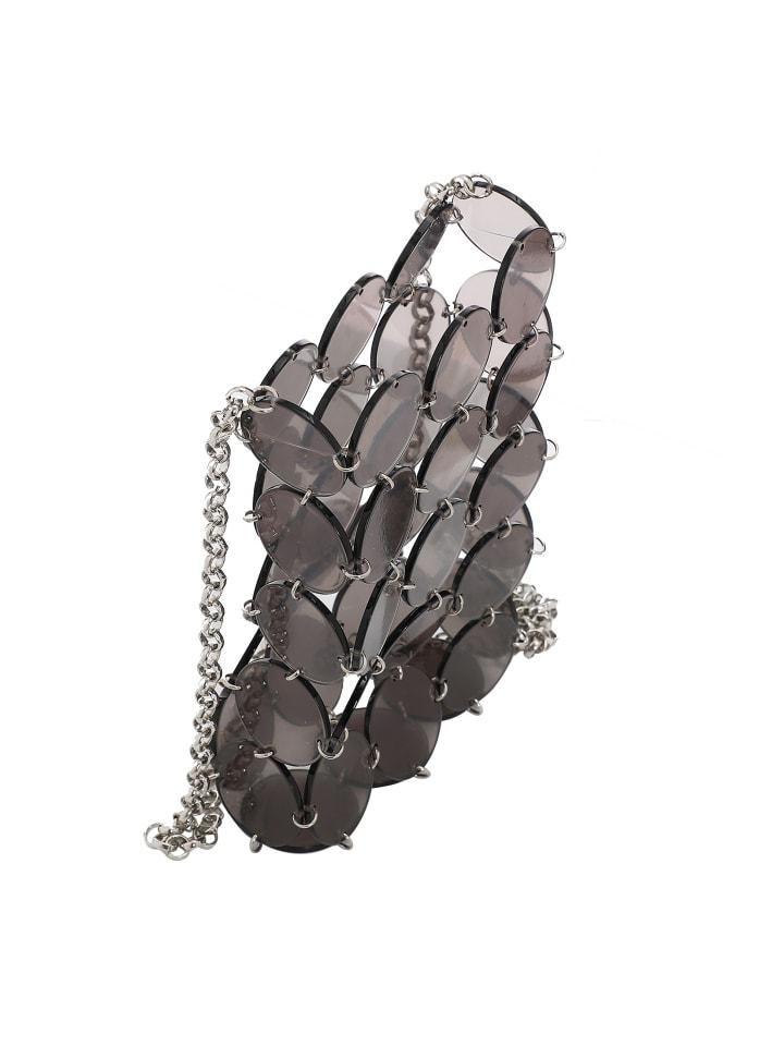 Откройте для себя эту стильную сумку через плечо с современным открытым дизайном, которая выделяется. Небольшие круглые диски, соединенные металлическими элементами, создают уникальную текстуру. Прямоугольная форма дополнена стильной цепочкой для удобной переноски. Украшенная пайетками и полупрозрачными вставками однотонного цвета, она станет идеальным аксессуаром для вечерних мероприятий.