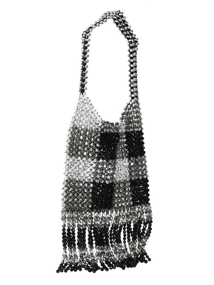 Откройте для себя эту элегантную сумку-трапецию, в которую легко поместятся все необходимые вещи формата А4. Стильная верхняя ручка и открытый дизайн дополнены блестящей бахромой из бисера, которая добавляет динамичности и изящества. Украшенное потрясающим набором бисера, это украшение идеально подходит для вечерних выходов, гармонично сочетая изысканность с современным шармом.