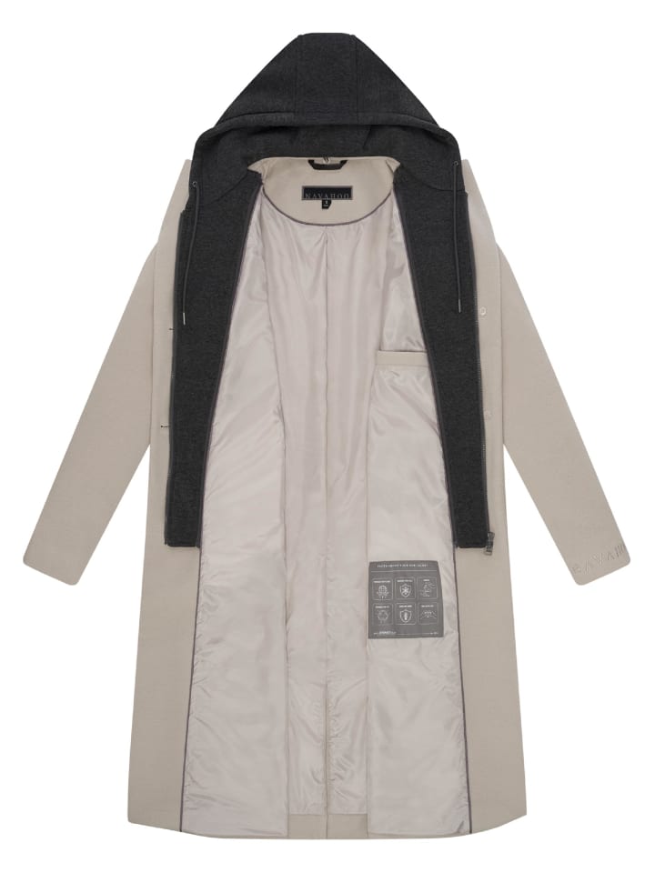 ПОКАТ: Переходное пальто имеет слегка свободный крой и отличную длину до колен. Разрез сзади по-прежнему обеспечивает достаточную свободу движений. Съемная вставка из трикотажной ткани обеспечивает гибкие варианты стилей - будь то спортивный или классический.