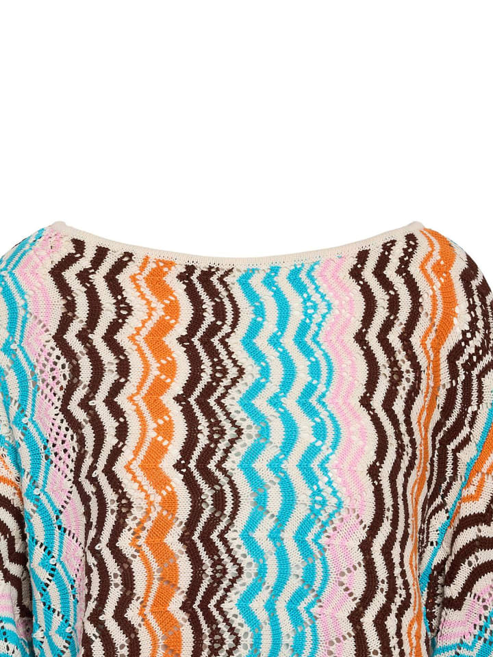Вязаный свитер от NOISY MAY сочетает в себе модный дизайн и повседневный комфорт. Эффектный зигзагообразный узор в различных цветовых нюансах делает его привлекающим внимание и придает любому образу креативный штрих.