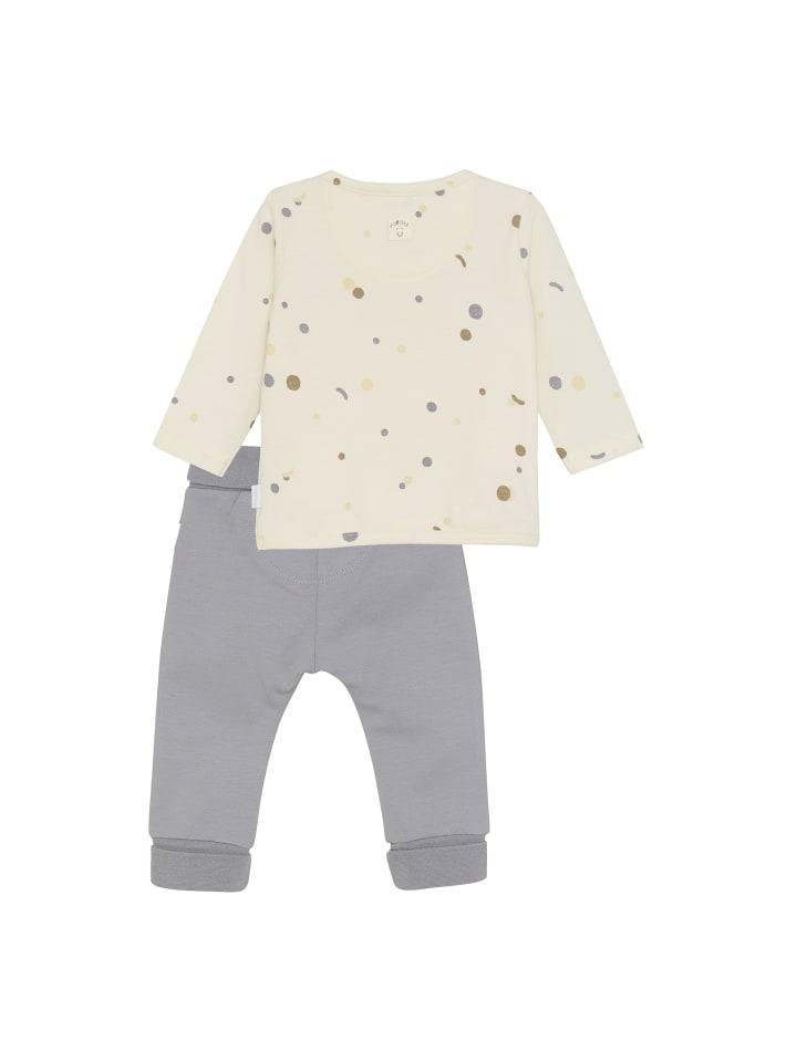 Комплект из двух предметов унисекс Saint Jo от Noppies Baby, изготовленный из хлопка, сертифицированного GOTS (CU1392474), состоит из топа с длинными рукавами и брюк из очень мягкого материала. Топ с длинными рукавами имеет сплошной принт, длинные рукава и застежку на кнопки вдоль окантовки. Однотонные брюки имеют эластичный пояс и резинки на штанинах.