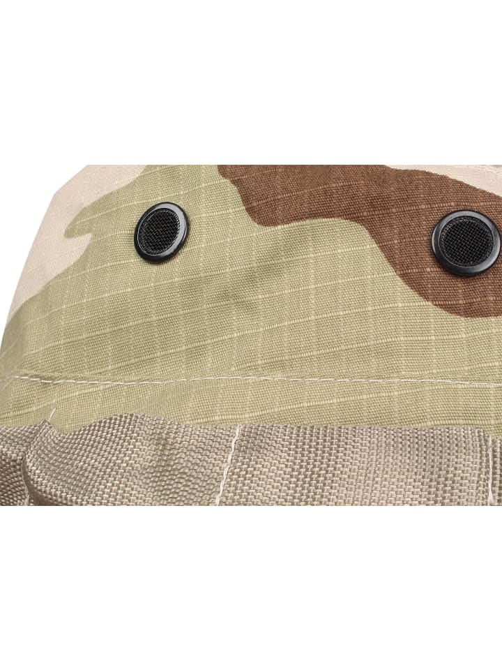 Четыре вентиляционных отверстия с москитными сетками, предотвращающими попадание мелких насекомых, а также дышащая, приятная для кожи хлопковая ткань обеспечивают приятную циркуляцию воздуха и, таким образом, повышают комфорт. Даже ветер в открытом внедорожнике не сдует панаму с головы, если плотно затянуть шнурок-фиксатор подбородочного ремня. Ремешок вокруг панамы имеет 12 петель MOLLE и изначально использовался для крепления боеприпасов. Сегодня в нее в основном вставляют небольшие веточки, прутья или пучки травы для маскировки.