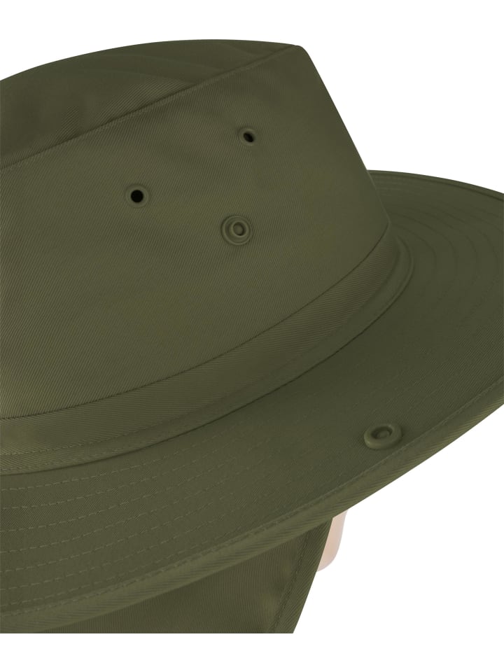 Шляпа-троллинг "Australian Outback" со съемным защитным шейным ремнем особенно полезна в регионах с продолжительным и интенсивным солнечным излучением. Широкие поля и сверхдлинный защитный шейный ремнем надежно защищают голову, лицо и шею от солнца. Защитный шейный ремнем легко отстегивается от шляпы с помощью молнии, превращая ее в простую австралийскую шляпу-троллинг. В сложенном виде ее можно сложить и хранить, например, в кармане брюк. При необходимости поля можно поднять с помощью кнопок с обеих сторон. Пять боковых вентиляционных отверстий и дышащая смесовая ткань обеспечивают приятную циркуляцию воздуха, регулируют микроклимат и тем самым повышают комфорт при ношении. При сильном ветре Австралийскую глубинку можно плотнее затянуть вокруг головы с помощью регулируемого подбородочного ремешка со шнурком, что предотвратит сдувание шляпы.