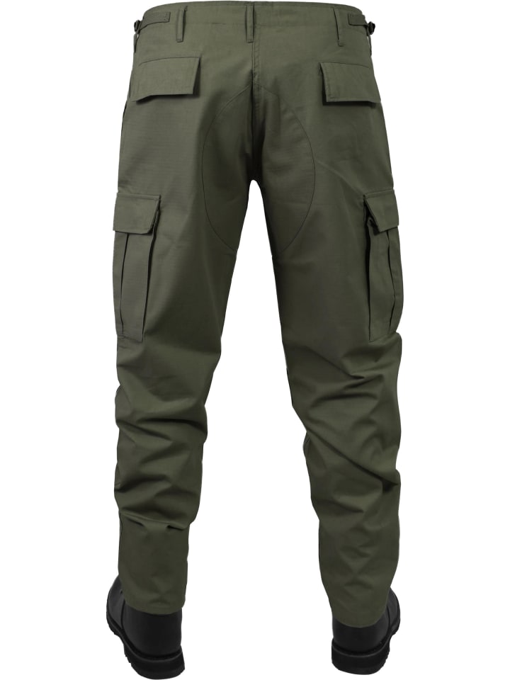 Ткань рипстоп очень тонкая и узнаваема по особому зигзагообразному рисунку. Через каждые несколько миллиметров в ткани проходит более прочная нить основы или утка. В случае разрыва материал не распространяется бесконтрольно по всей поверхности, а останавливается на более прочной нити рипстопа. Таким образом, материал восстанавливает свою исключительную прочность и устойчивость к разрывам. Материал также обладает ветро- и водоотталкивающими свойствами. Брюки имеют усиления в области ягодиц и коленей, а ширинка застегивается на потайную планку с пуговицами. Регулируемый пояс и манжеты на штанинах со шнурками позволяют регулировать размер и оптимальную посадку.