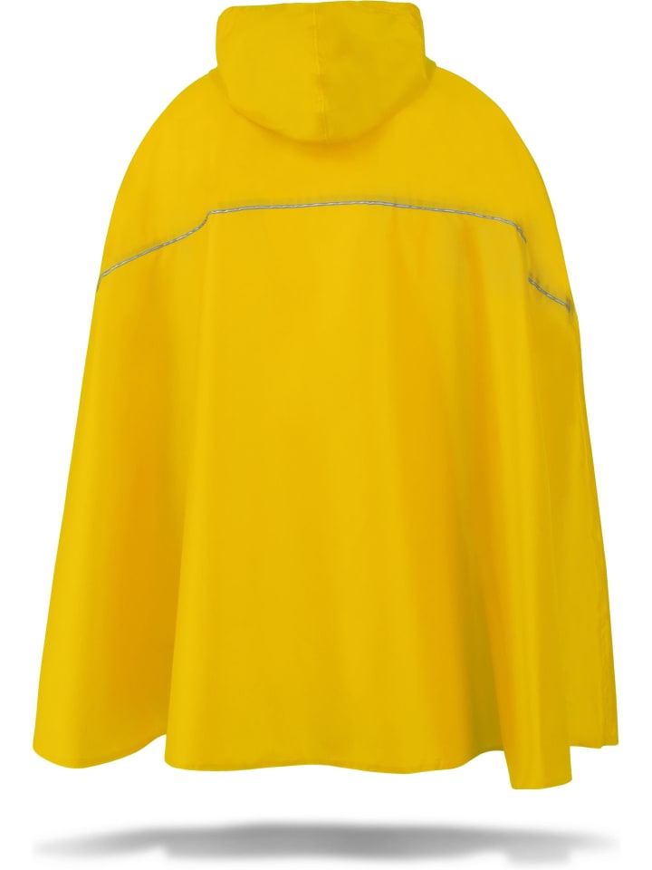 Для ежедневных поездок на велосипеде были добавлены две дополнительные функции. Дождевик-пончо оснащен светоотражающими полосами 3M Scotchlite с обеих сторон, что повышает безопасность на дороге и позволяет быстро обнаружить нарушителя в сумерках. Кроме того, снизу предусмотрены практичные петли для рук и поясной ремень, которые предотвращают раздражающее развевание на ветру. Под пончо можно даже носить небольшой рюкзак. Два боковых клапана с кнопками позволяют при необходимости продеть руки и кисти рук в пончо.