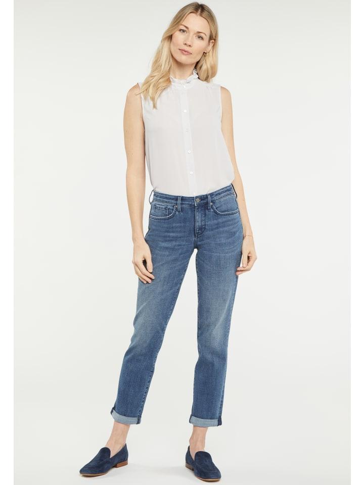 Ищете повседневные джинсы с идеальной посадкой? NYDJ Girlfriend Jeans - это то, что вам нужно. Они облегают фигуру плотнее, чем джинсы-бойфренды, сохраняя при этом комфортную свободную посадку. Наша фирменная технология Lift Tuck с уникальной перекрещивающейся вставкой подчеркивает женственные изгибы, создавая красивый силуэт. Брюки имеют классический крой с пятью карманами, застежку на молнию и пуговицы и подвернутый нижний край.