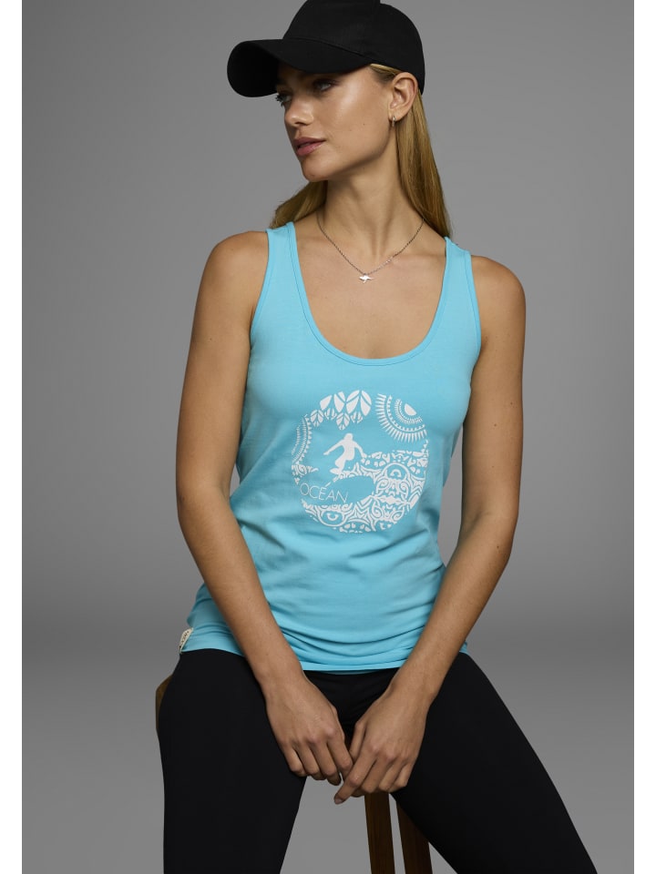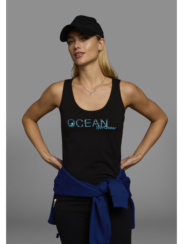 Простая женская майка от бренда Ocean Sportswear. Облегающий крой и стильный принт с логотипом. Топ плавно облегает фигуру благодаря эластичному трикотажу.