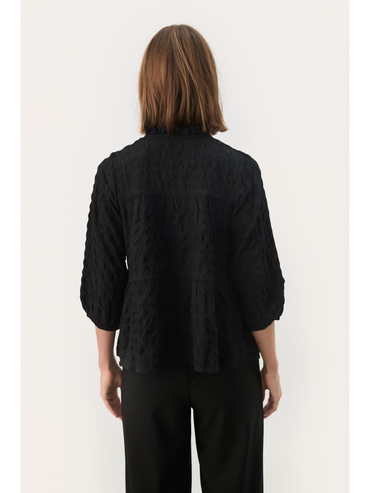 Блузка свободного кроя с тонким кроем и присборенными плечами. Оборка на горловине с завязкой и рукава три четверти для стильного повседневного образа.