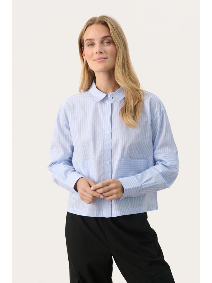 Рубашка свободного кроя в полоску прямого силуэта с острым воротником, планкой на пуговицах и длинными рукавами. Горизонтальные передние карманы подчеркивают дизайн.