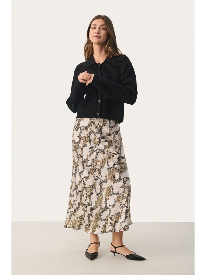 Эта женская юбка миди имеет классический крой и струящийся силуэт для комфортной посадки. Эластичный пояс и гладкая ткань делают ее универсальной для разных случаев.