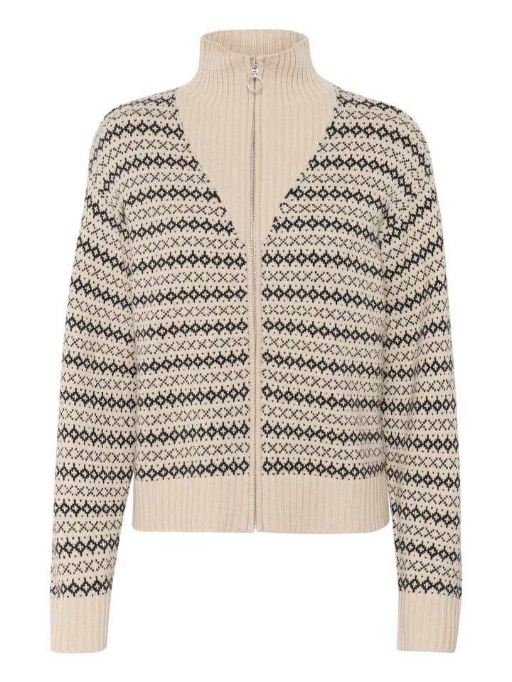 Кардиган прямого покроя на молнии с геометрическим узором, высоким ребристым воротником, длинными рукавами, ребристыми манжетами и подолом.