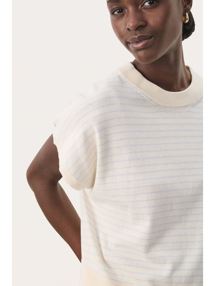 Трикотажный топ в полоску свободного, свободного кроя, с короткими рукавами, круглым вырезом и широким поясом в рубчик. Современный, лаконичный вид.