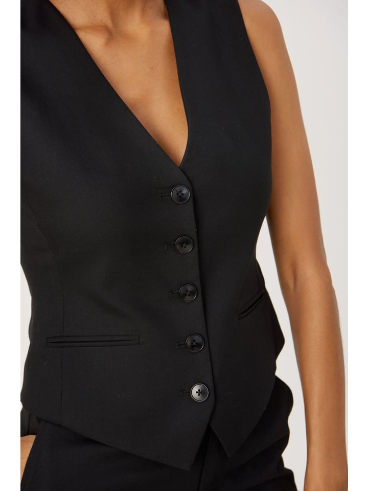 Жилет облегающего кроя с V-образным вырезом, планкой на пуговицах и двумя карманами с окантовкой. Элегантный, лаконичный и структурированный дизайн.