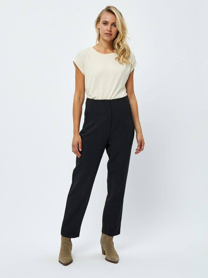 Брюки прямого кроя с высокой талией и застежкой на крючок. Передние прорезные карманы и вытачки спереди и сзади придают брюкам приталенный вид. Сзади ложные прорезные карманы, а также вырез по центру спинки.