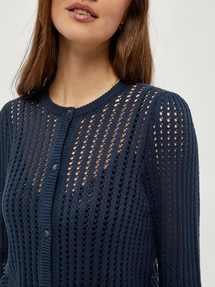 Хлопковый трикотаж с ажурным узором вдохнул новую жизнь в классическое качество хлопка. Кардиган отлично сочетается с другими изделиями тон в тон и представлен в классическом темно-синем цвете, а также в актуальном в этом сезоне коричневом цвете глазированный имбирь.