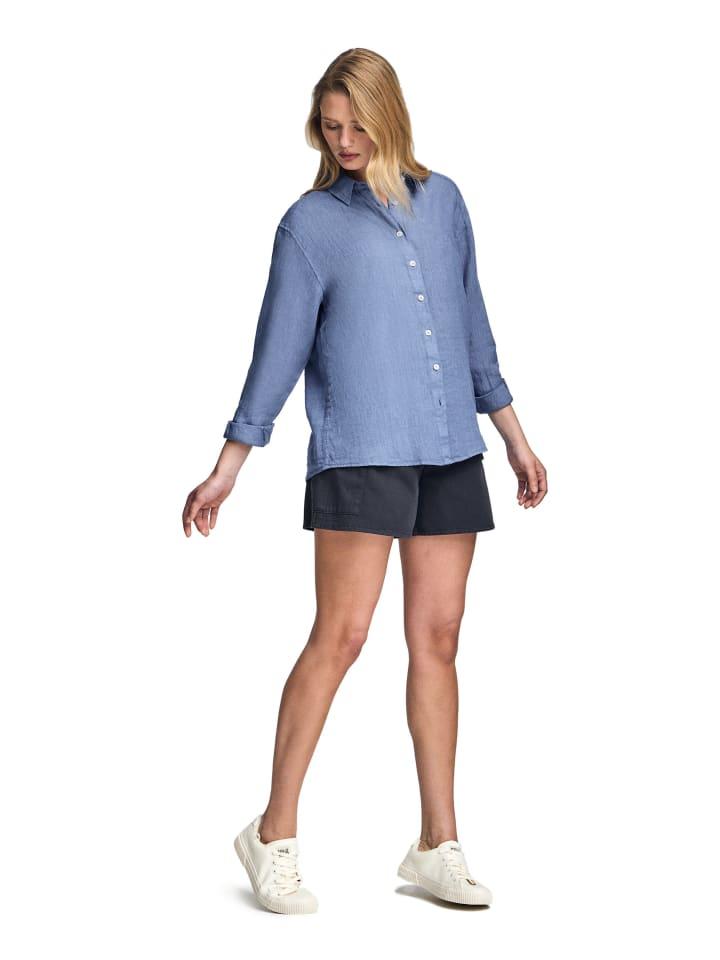 Эта женская льняная рубашка, окрашенная в готовом виде, сочетает в себе комфорт и изысканность. Свободный крой и отложной воротник придают ей непринужденный вид, а перламутровые пуговицы с логотипом и окантовка в тон на внутренней стороне воротника добавляют особый акцент. Вышитая монограмма PC на груди завершает элегантный и классический дизайн.
