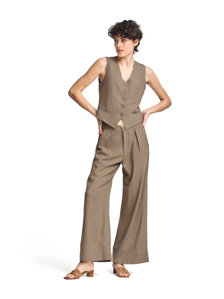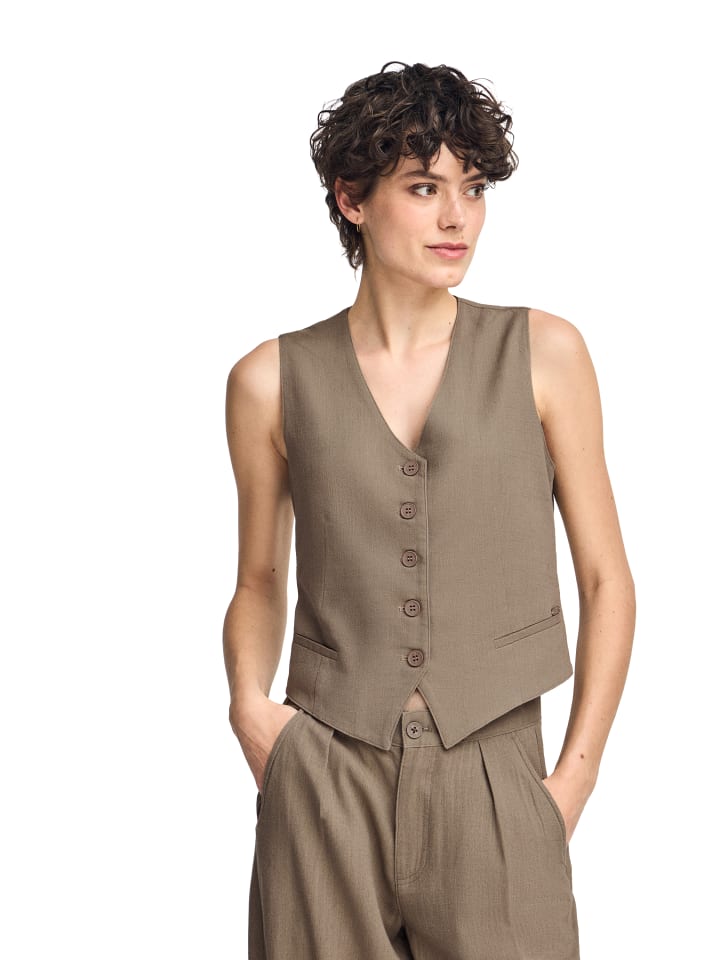 Жилет Deia - универсальная и элегантная вещь для женщин, которые ценят комфорт, не жертвуя стилем. Приталенный крой обеспечивает идеальную посадку, а сочетание хлопка и льна гарантирует свежесть даже в теплые летние дни. Застежка на пуговицы, декоративные боковые карманы и жемчужная пуговица Polo Club придают ему изысканный вид. Идеально сочетается с брюками Deia или легкой блузкой, создавая изысканный образ.