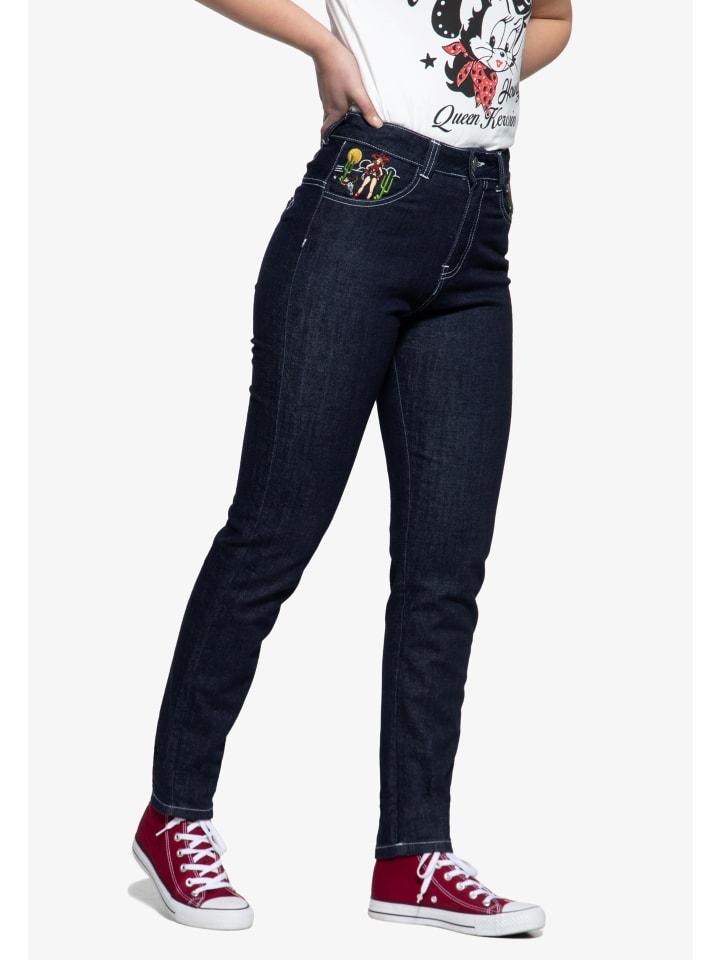 Ищете стильные и удобные джинсы? У нас есть то, что вам нужно! Джинсы Queen Kerosin Western сочетают в себе дизайн в стиле вестерн 50-х годов с высококачественной вышивкой спереди и сзади. На брюках есть боковые и задние карманы для самых необходимых вещей. Стираный эффект придает брюкам стиль дикий вестерн, который идеально подходит вашему стилю рокабилли. Узкий крой обеспечивает плотную посадку и подчеркивает фигуру. В этих брюках вы станете звездой и привлечете внимание на любом мероприятии. Так чего же вы ждете? Закажите джинсы Queen Kerosin Western прямо сейчас и покажите всем свой уникальный стиль!
