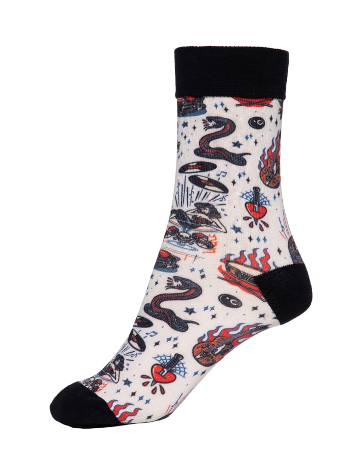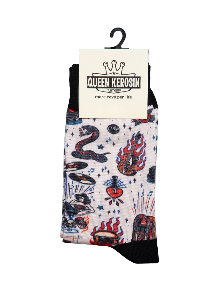 Эти носки Queen Kerosin подарят вам винтажный стиль и рок-н-ролльный настрой с головы до ног! Детализированный дизайн по всей поверхности украшен культовыми мотивами, такими как горящие гитары, змеи, виниловые пластинки, девушки в стиле пин-ап, музыкальные автоматы и сердца с кинжалами - настоящая приманка для всех, кто любит музыку, ретро-стиль и бунтарский дух. Мягкий материал обеспечивает удобную посадку, а эластичные манжеты - надежную фиксацию.