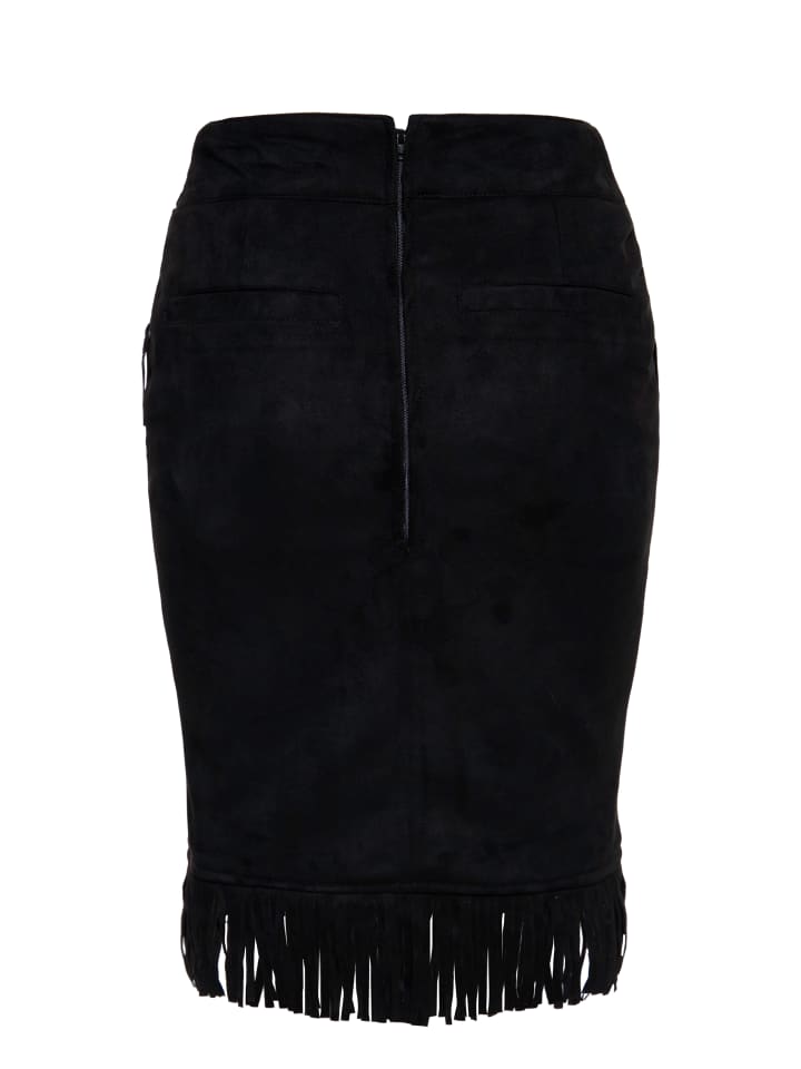 Эта юбка-карандаш от Queen Kerosin привнесет нотку вестерн-шика в ваш гардероб! Эффектная бахрома на карманах и подоле делает ее настоящей приманкой для стильных ковбоев. Благодаря облегающему крою из замши юбка идеально сидит по фигуре и создает женственный силуэт. Декоративная планка с пуговицами спереди и изогнутые швы на бедрах придают ей уникальный образ с рок-н-ролльным настроением. В сочетании с подходящим жакетом с бахромой она создает эффектный образ для уверенных в себе!