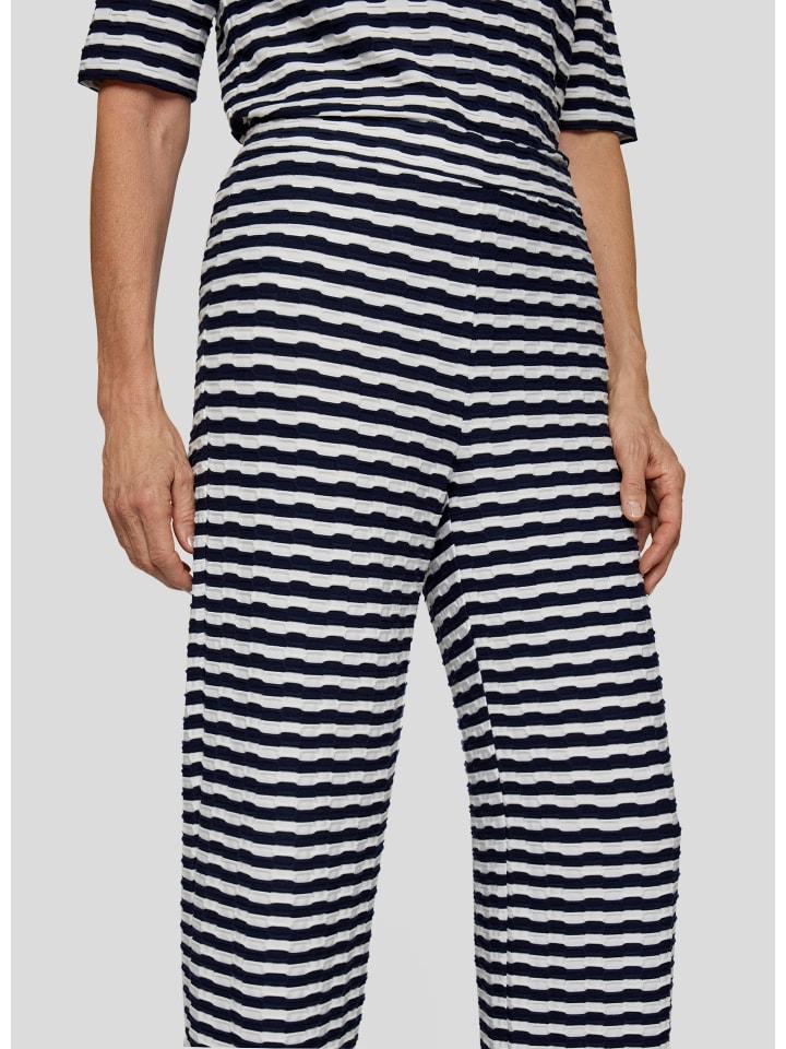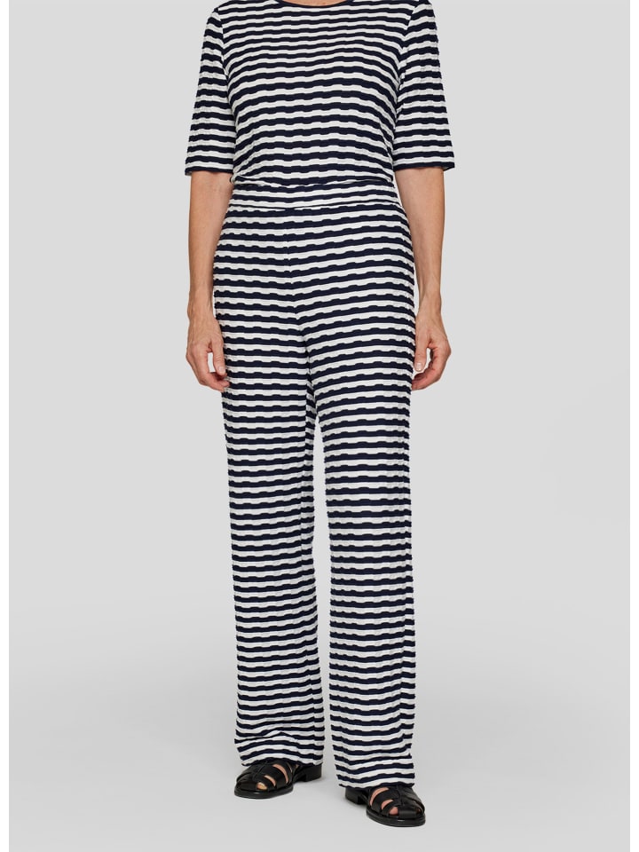 Эти трикотажные брюки сочетают в себе комфорт и современный вид. Волнообразный полосатый рисунок придает модели особую динамичность и делает ее привлекательным элементом для создания непринужденных летних образов. Мягкая ткань удобно облегает фигуру, а эластичный пояс обеспечивает удобную посадку. Мягкий трикотаж с струящейся драпировкой.