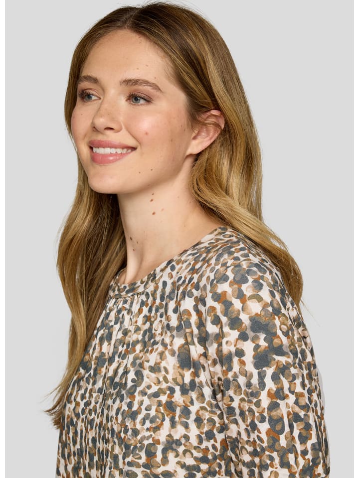 Удобная рубашка со стильным рисунком для повседневной носки и отдыха. Этот топ из эластичной вискозной смеси впечатляет графическим принтом, классическим круглым вырезом и тонкими складками на горловине. Облегающий крой обеспечивает удобную посадку. Мягкий трикотаж с вискозой. Эластичный и комфортный. Изящные складки спереди. Круглый вырез. Графический рисунок по всей поверхности.