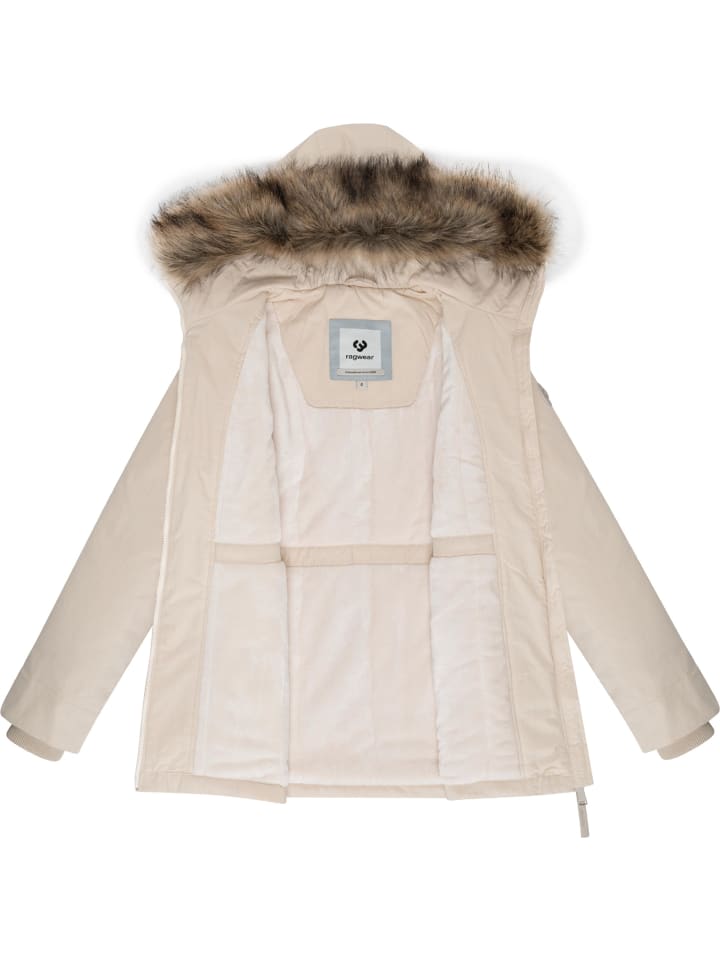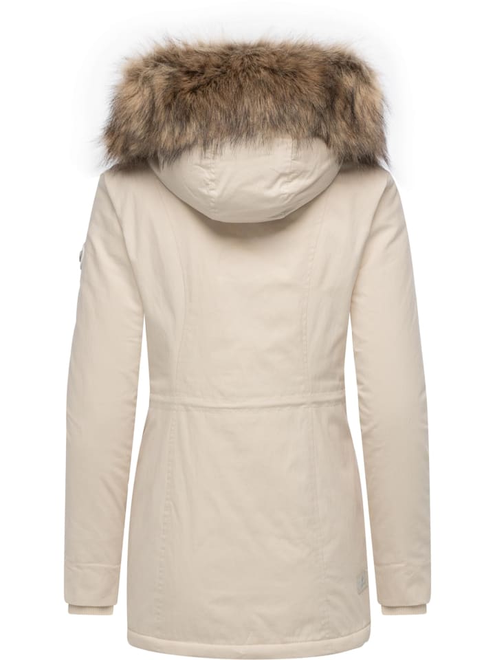 Регулируемый шнурком капюшон с отделкой из искусственного меха.