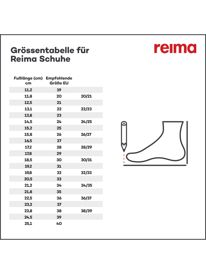 Очень легкие, высокие, до щиколотки, кроссовки без застежек. Эластичный, дышащий верх и нескользящая подошва. Можно стирать в стиральной машине при температуре до 30°C, материал изготовлен из переработанных материалов. Идеальная летняя обувь для легкого надевания. Наши классические тапочки очень легкие и так легко надеваются, что справится любой ребенок! И они еще лучше для окружающей среды: их воздушный верх изготовлен из переработанных волокон. Какой размер обуви подойдет моему ребенку? Мы упростим вам задачу. Большинство обуви Reima оснащены системой измерения Happy Fit: съемной стелькой с принтом, которая помогает подобрать правильный размер и посадку. Если стопа находится на улыбающемся смайле или ниже, обувь подходит. Если стопа выходит за пределы линии, пришло время для следующего размера.