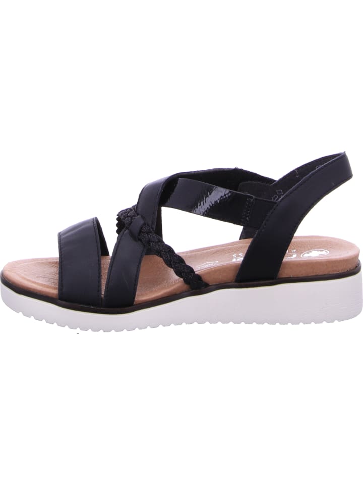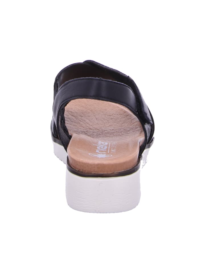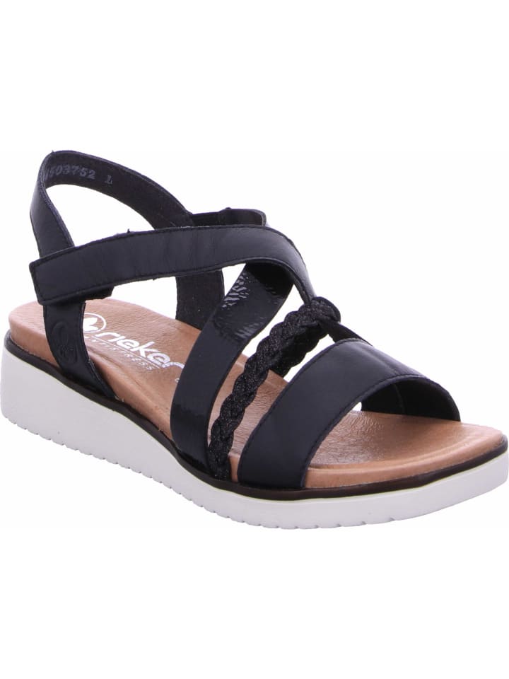 Вершина комфорта! Эти босоножки Rieker на танкетке темно-черного цвета из гладкой кожи станут вашими незаменимыми спутниками. Благодаря перекрещенным ремешкам и застежке-липучке босоножки идеально адаптируются к форме стопы. Узкий ремешок на пятке обеспечивает дополнительную поддержку. Ультралегкая и гибкая подошва с танкеткой бережно облегает каждый шаг. Узкая колодка E 1/2 обеспечивает идеальную посадку. Модное ощущение благополучия в стиле Rieker!